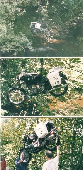It's never really a good idea to ride a BMW over a 10-ft bank into a deepish river. I got the bike home, drained and re-oiled everything, rebuilt the fibre-glass top box, squashed the speedo back into shape, replaced the handle bars and she was as good as new. (They don't make them like they used to!) |