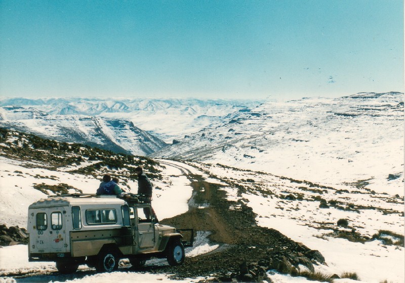 My old straight-6 diesel Land Cruiser in Lesotho snow on the road to Mokotlong.